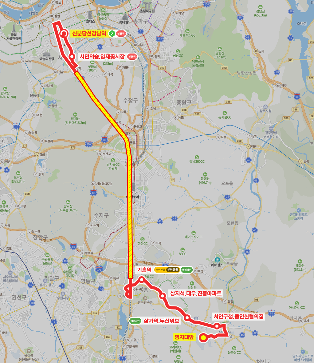 ◼ 상세 경유지 : 명지대앞 ↔ 동진마을 ↔ 교수마을 ↔ 보보스타운 ↔ 남동구미마을 ↔ 태성중고등학교.현대아파트 ↔ 현대아파트상 ↔ 용인터미널 ↔ 용인시장.시장약국 ↔ 처인구청.용인헌혈의집 ↔ 중앙지구대 ↔ 역북초.벽산블루밍.삼환나우빌 ↔ 명지대입구 ↔ 동원로얄듀크.용인등기소 ↔ 역말마을 ↔ 시청.용인대역 ↔ 진우아파트 ↔ 삼가동.궁촌상 ↔ 삼가역.두산위브 ↔ 효자고개 ↔ 인정프린스.흥국생명연수원 ↔ 수원동.쌍용아파트 ↔ 상지석.대우.진흥아파트 ↔ 현대출고장.고인돌 ↔ 어정삼거리.강남마을 ↔ 강남대역.강남대입구 ↔ 수원컨트리클럽 ↔ 기흥역 ↔ 롯데캐슬스카이.이안두드림.백남준아트센터 ↔ 상미마을.신갈오거리 ↔ 고속도로 무정차 ↔ (신논현역.주류성빌딩 → 신분당선강남역(중)⟲ → 우성아파트(중) → 뱅뱅사거리(중) → 양재역.서초문화예술회관(중) → 교육개발원입구(중) → 매헌시민의숲.양재꽃시장) 이하 역순