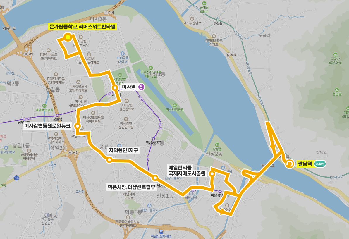 → 망월초등학교 ▷ 미사강변리버뷰자이 ▷ 은가람중학교(기점) ▷ 미사강변리버스위트칸타빌 순으로 단방향 운행합니다.