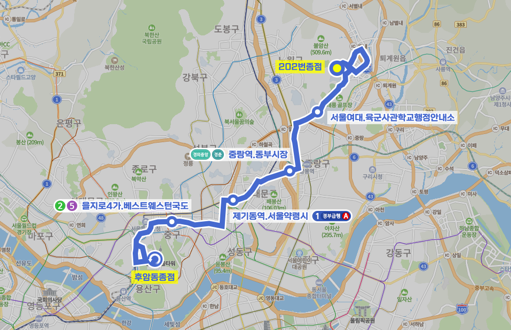 ◼ 상세 경유지 : 202번종점 ↔ 불암동 ↔ 신안인스빌아파트 ↔ 별빛마을3단지 ↔ 화접초등학교.별내고등학교 ↔ KCC스위첸아파트 ↔ 별내리슈빌아파트 ↔ 주을곡.남재공원 ↔ 효성해링턴코트.별내커뮤니티센터 ↔ 별사랑마을2-7단지 ↔ 포스코더샵아파트.별사랑마을2-9단지 ↔ 동익미라벨 ↔ 별내동주민센터앞.쌍용예가정문 ↔ 쌍용예가.미리내마을4-4단지 ↔ 미리내마을4-2단지.한별초등학교 ↔ 삼육대후문.논골.한화아파트 ↔ 담터고개 ↔ 삼육대앞 ↔ 한국스포츠정책과학원 ↔ 태릉선수촌 ↔ 태릉 ↔ 태릉국제사격장 ↔ 서울여대.육군사관학교행정안내소 ↔ 경춘선숲길.화랑대역공원 ↔ 화랑대사거리 ↔ 화랑대역2번출구상 | 화랑대역1번출구하 ↔ 태릉입구상 | 주유소앞다운복지관하 ↔ 묵동구길 ↔ 묵1동주민센터입구.먹골역 ↔ 먹골역 ↔ 한국전력동부지사 ↔ 지하철7호선중화역 ↔ 국민은행중화동지점상 | 중화동한신아파트하 ↔ 중랑역.동부시장 ↔ 중랑교 ↔ 삼육서울병원 ↔ 시조사삼거리상 | 휘경동입구하 ↔ 떡전교사거리.동대문노인복지관상 | 서울성심병원하 ↔ 청량리미주아파트.동대문세무서상 ↔ 청량리역환승센터 ↔ 청량리.청과물도매시장상 | 청량리수산시장하 ↔ 제기동역.서울약령시 ↔ 서울시동부병원 ↔ 동아제약앞 ↔ 청계벽산아파트.텐즈힐아파트 ↔ 상왕십리역.센트라스아파트 ↔ 상왕십리역상 | 뉴타운아파트하 ↔ 왕십리센트라스아파트상 | 신당파인힐하나유보라하 ↔ 성동고등학교 ↔ 신당역.중앙시장앞 ↔ 충무아트센터.스포츠센터.중부소방서 ↔ 동대문역사문화공원하 ↔ 을지로6가.국립중앙의료원 ↔ 을지로5가.중부시장 ↔ 을지로4가.베스트웨스턴국도 ↔ 을지로3가 ↔ 을지로2가.파인에비뉴하 ↔ 을지로2가.기업은행본점.서울노동청상 | 을지로입구.로얄호텔하 ↔ 롯데백화점상 | 롯데영프라자하 ↔ 북창동.남대문시장상 | 남대문시장앞.이회영활동터하 ↔ 숭례문 ↔ (서울역버스환승센터 → 갈월동 → 남영우체국 → 용산중고 → 후암동종점⟲ → 용산중고 → 후암시장 → 후암삼거리 → 남대문경찰서) 이하 역순