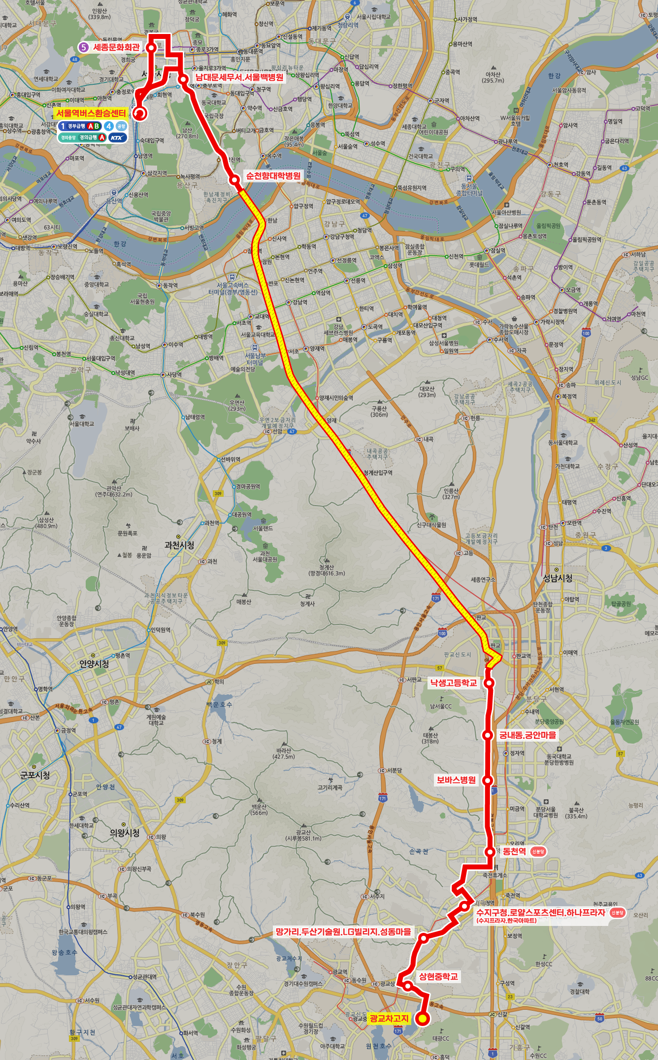 ◼ 상세 경유지 : 광교차고지 ↔ 광교숲속마을.광교마을40단지 ↔ 상현고등학교 ↔ 상현중학교 ↔ 상현교차로.성원.쌍용.금호.현대2.5차아파트 ↔ 서원말.심곡서원.상현지구대.금호.현대아파트 ↔ 풍산아파트.벽산아파트.힐스테이트 ↔ 성동마을상 | 망가리.두산기술원.LG빌리지하 ↔ 정평상 | 윤약국.정평마을.삼성쉐르빌.태영아파트하 ↔ 수지지역난방공사 ↔ 풍덕고교.성원아파트.지역난방공사.정평중학교 ↔ 풍덕천2동주민센터.현대성우아파트 ↔ 신월초교.상록아파트.주공9단지.공무원아파트 ↔ 주공아파트상 ↔ 수지프라자.한국아파트상 | 수지구청.로얄스포츠센터.하나프라자하 ↔ 한성아파트.한국아파트.현대1차아파트 ↔ 삼성1차.보원.건영아파트 ↔ 동부아파트 ↔ 수지고등학교.삼성4차아파트 ↔ 수지중학교 ↔ 초입마을.삼익풍림동아아파트 ↔ 한국물류센타 ↔ KT수지지사.물류센터 ↔ 동천역 ↔ 머내기업은행 ↔ 동원동하 ↔ 쓰레기매립장.로얄냉장 ↔ 보바스병원 ↔ 쇳골마을.궁내동톨게이트 ↔ 궁내동.궁안마을 ↔ 궁내동하 ↔ 성남외고입구 ↔ 낙생고등학교 ↔ 고속도로 무정차 ↔ 순천향대학병원 ↔ (남대문세무서 → 종로2가 → 조계사 → 세종문화회관 → 삼성프라자 → 서울역버스환승센터(중)⟲ → 숭례문 → 명동국민은행앞 → 중앙시네마.백병원(중)) 이하 역순