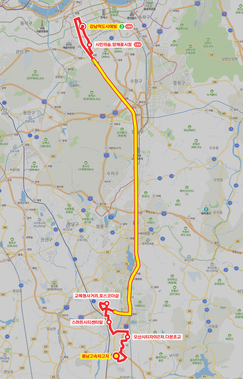 ◼ 상세 경유지 : 용남고속차고지 ↔ 오산청호아파트 ↔ 오산청호아파트 ↔ 오산빌리지상 | 고현아이파크하 ↔ 대우푸르지오 ↔ 대원아파트 ↔ 오산시티자이1.2단지 ↔ 오산시티자이2차.다온초교 ↔ 오산센트럴푸르지오상 | 운암주공1단지후문하 ↔ 문화예술회관.고용복지플러스센터 ↔ 은계주공아파트.리버빌아파트 ↔ 화성초교 ↔ 수청주공아파트 ↔ 매홀중학교 ↔ 스마트시티센터앞 ↔ 세미초등학교 ↔ 세교자이후문 ↔ 교육청사거리.포스코더샵 ↔ 고속도로 무정차 ↔ (KCC사옥 → 신논현역.인터파크 → 강남역도시에빛⟲ → 역삼동.역삼동.우성아파트 → 서초문화예술정보학교 → 양재역엘타워빌딩 → 매헌시민의숲.양재꽃시장) 이하 역순
