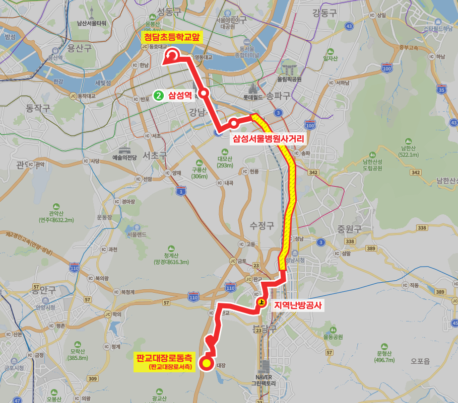 ◼ 막차 : 판교대장로동측 - 22:20 | 청담초등학교앞 - 23:25