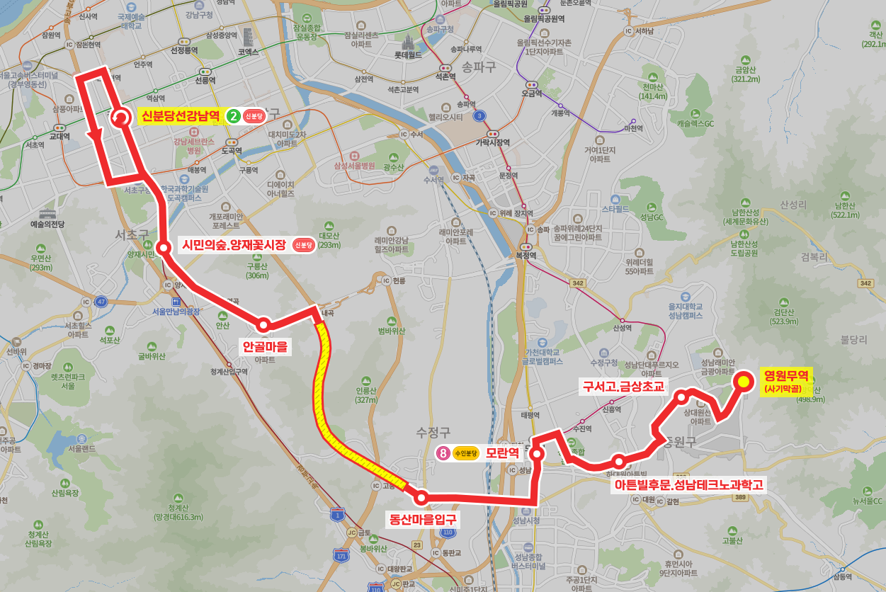 ◼ 상세 경유지 : 영원무역사기막골 ↔ SK테크노파크 ↔ 공단파출소 ↔ 우림라이온스밸리5차상 | 에스콰이어하 ↔ 선경아파트.성남중원경찰서 ↔ 성남중원경찰서 ↔ 구서고.금상초교 ↔ 대일초교.학년쇼핑 ↔ 현성아름빌아파트 ↔ 상대원시장.새마을금고 ↔ 상대원시장하 ↔ 대원터널사거리.우리은행 ↔ 성남자이아파트상 | 성남냉동하 ↔ 대하초등학교.중원청소년수련관상 | 아튼빌아파트.중원청소년수련관하 ↔ 아튼빌후문.성남테크노과학고 ↔ 영성중학교.하대원동행정복지센터 ↔ 하대원시장하 ↔ 제일아파트.현대아파트.중원도서관 ↔ 중원구청 ↔ 풍생고등학교.풍생중학교상 | 모란역.모란시장입구.풍생중고교하 ↔ 모란역(광역.시외버스)상 | 모란역2.3번출구하 ↔ 성남시청후문 ↔ 모란차량기지앞 ↔ 시흥동행정복지센터 ↔ 시흥동농협창고 ↔ 동산마을입구 ↔ 고속도로 무정차 ↔ 서울특별시어린이병원.강동-송파예비군 ↔ 안골마을 ↔ 서초포레스타입구 ↔ 탑성마을 ↔ 염곡마을 ↔ 매헌시민의숲.양재꽃시장 ↔ 교육개발원입구(중)상 ↔ 양재역.서초문화예술회관(중)상 | 양재역커피빈앞하 ↔ (뱅뱅사거리(중) → 우성아파트(중) → 신분당선강남역(중)⟲ → 지하철2호선.강남역(중) → 신논현역.구교보타워사거리 → 제일약품사옥 → 서초구청) 이하 역순