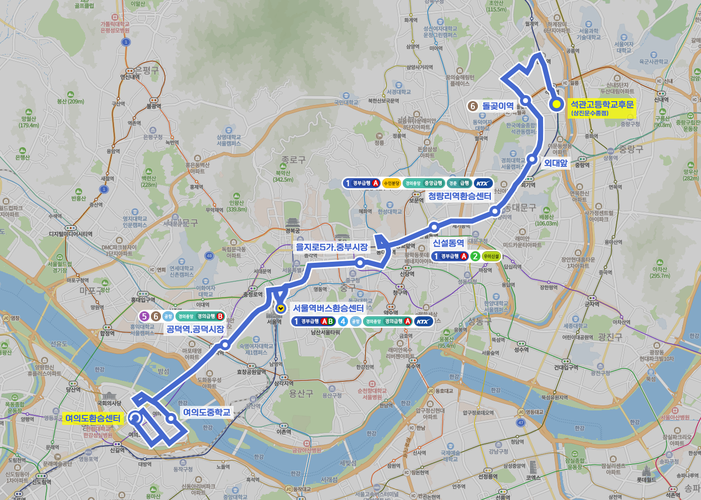 ◼ 상세 경유지 : 석관고등학교후문상진운수종점 ↔ 석계역 ↔ 석계역1번출구상 ↔ 물류센터 ↔ 월계현대아파트 ↔ 광운대역 ↔ 월계삼거리 ↔ 광운대학교 ↔ 광운전자공업고등학교상 | 광운중학교하 ↔ 벼루말교 ↔ 장위래미안아파트 ↔ 꿈의숲아이파크아파트 ↔ 장곡초교사거리 ↔ 하나은행장위동지점 ↔ 장위동원천주유소 ↔ 장위2동주민센터 ↔ 돌곶이역 ↔ 석관시장 ↔ 석관동새마을금고 ↔ 한국예술종합학교 ↔ 의릉입구 ↔ 이문동우체국상 | 이문동교회하 ↔ 외대앞 ↔ 경희중고 ↔ 회기시장 ↔ 회기동현대아파트상 | 우산빌딩앞하 ↔ 떡전교사거리.동대문노인복지관상 ↔ 청량리미주아파트.동대문세무서상 | 서울성심병원하 ↔ 청량리역환승센타 ↔ 청량리.청과물도매시장상 | 청량리수산시장하 ↔ 제기동역.서울약령시 ↔ 용두동사거리.한국의류시험연구원 ↔ 신설동역 ↔ 동묘앞 ↔ 동대문(흥인지문) ↔ 상종로중부새마을금고 ↔ 동대문역사문화공원 ↔ 을지로6가.국립중앙의료원 ↔ 을지로5가.중부시장 ↔ 을지로4가.베스트웨스턴국도 ↔ 을지로3가 ↔ 을지로2가.파인에비뉴하 ↔ 을지로2가.기업은행본점.서울노동청상 | 을지로입구.로얄호텔하 ↔ 롯데백화점상 | 롯데영프라자하 ↔ 북창동.남대문시장상 | 남대문시장앞.이회영활동터하 ↔ 상염천교 | 하서울역버스환승센터 → 숭례문 ↔ 중림동교차로상 ↔ 서울의료보건고등학교,서울역서부 ↔ 손기정체육공원입구 ↔ 만리동고개 ↔ 한겨레신문사 ↔ 신덕성결교회 ↔ 공덕역.공덕시장 ↔ 마포역 ↔ 상여의도순복음교회 → 여의도공원 ↔ 여의나루역 ↔ 여의도중학교 ↔ 63빌딩.가톨릭대학교여의도성모병원 ↔ 여의동주민센터 ↔ (KBS별관 → 샛강역1번출구.여의도자이 → 여의도역 → 여의도환승센터⟲ → 유진투자증권.파이낸셜뉴스신문 → 하나은행여의도지점) 이하 역순