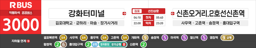 인천/김포/서울시 직행좌석버스 선진상운 3000번 (강화터미널.김포대학교 ↔ 합정역.홍대입구역.신촌역2호선)