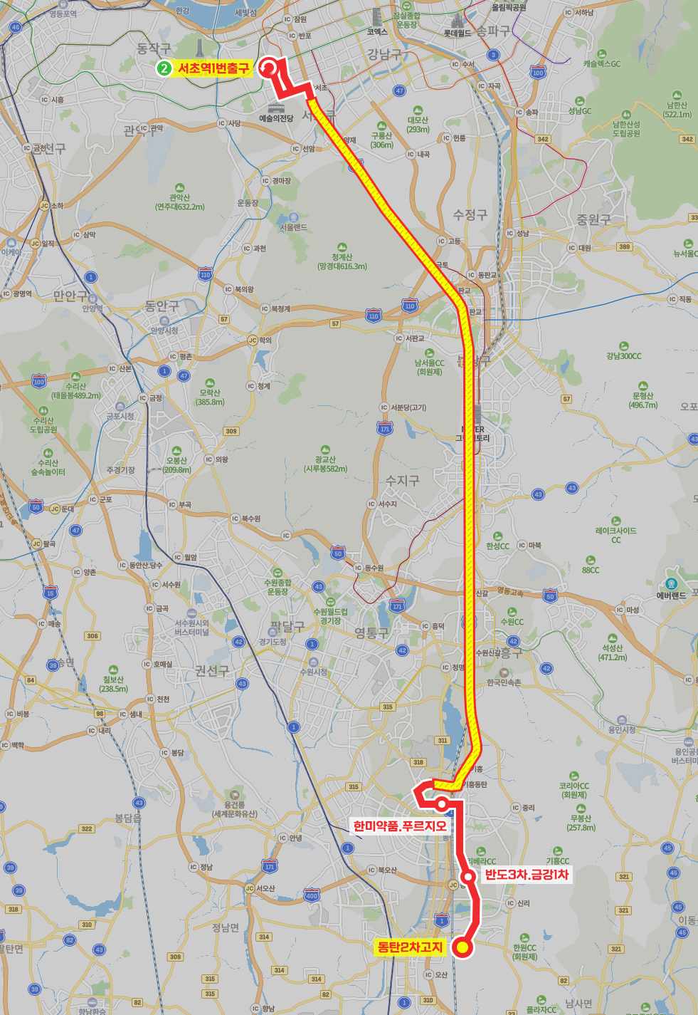 ◼ 첫차 : 동탄2차고지 - 05:00 | 서초역1번출구 - 06:10