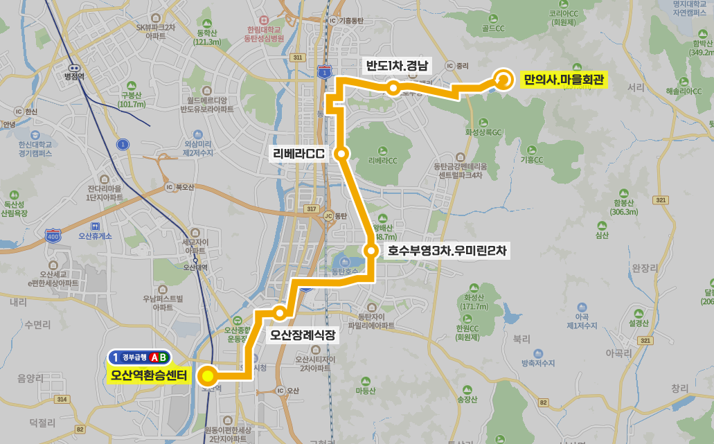 ◼ 상세 경유지 : 오산역환승센터 ↔ 문화의거리상 | 국민은행(마을)하 ↔ 신양아파트사거리하 ↔ 운암주공5단지.운암중학교 ↔ 오산시청.운암주공4단지 ↔ 운암주공2.3단지.운천고 ↔ 운암주공1단지.운천중학교 ↔ 운암주공1단지후문상 | 오산센트럴푸르지오하 ↔ 오산장례식장 ↔ 장지천 ↔ DM디스플레이상 ↔ 화남초상 | 여울보건지소하 ↔ 레이크자연앤푸르지오상 | 경기도시공사동탄사업단하 ↔ 동탄호수공원.부영4차 ↔ 호수부영3차.우미린2차 ↔ 나래학교.더샵레이크상 | 레이크빌.하우스디더레이크하 ↔ 반도3차.금강1차 ↔ 의료시설부지상 | 공공청사부지하 ↔ 리베라CC ↔ 한화.린스트라우스 ↔ 동탄역 ↔ 우남퍼스트빌 ↔ 우남퍼스트빌.자이 ↔ 계룡.영천초 ↔ 시범예미지.영천유치원 ↔ 반도1차.경남 ↔ 무봉초 ↔ 단독주택 ↔ 치동천힐링마을하 ↔ 일진정공 ↔ 상록골프장 ↔ 만의사.마을회관⟲ 이하 역순