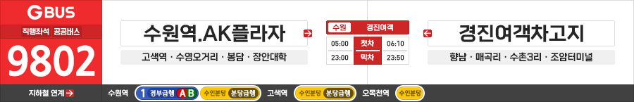 수원/화성시 직행좌석버스 경진여객 9802번 (수원역.AK플라자.역전시장.고색역 ↔ 조암시장.경진여객차고지)