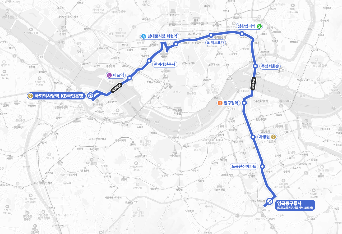 → 국회의사당 ▷ 염곡동 방면만 서울역버스환승센터, 왕십리역 정류장을 경유하오니, 이 점 참고하시기 바랍니다.