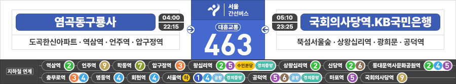 서울특별시 간선버스 대흥교통 463번 (염곡동구룡사.도곡한신아파트 ↔ 국회의사당역.KB국민은행)