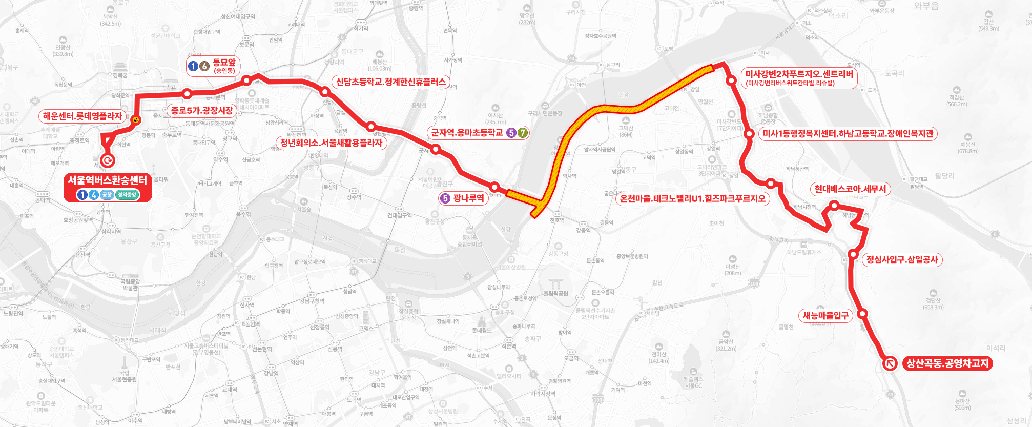 ◼ 상세 경유지 : 상산곡동.공영차고지 ↔ 산곡초등학교.검단산입구 ↔ 새능마을입구 ↔ 하산곡삼거리 ↔ 천현동행정복지센터입구 ↔ 복지회관.하남경찰서.등기소.마루공원 ↔ 정심사입구.삼일공사 ↔ 검단산입구.한국애니메이션고교하 ↔ 신안아파트후문 ↔ 꿈동산신안.창우마을.은행아파트 ↔ 하남검단산역.창우초교.부영아파트 ↔ 소방서하 ↔ 더우개마을동일.한국아파트상 | 백송한신.백조현대아파트하 ↔ 현대베스코아.세무서 ↔ 하남시청 ↔ 하남시청정문.홈플러스 ↔ 현대홈타운상 | 하남시평생학습관하 ↔ 천현사거리.천현공원 ↔ 성광학교 ↔ 하남지구대상 ↔ 동부주유소 ↔ 신장사거리.신장시장 ↔ 덕풍시장.하남우체국.KT하남지사 ↔ 덕풍초등학교 ↔ 덕풍2동행정복지센터.청소년문화의집.농협 ↔ 덕풍수리골공영주차장 ↔ 온천마을.테크노밸리U1.힐즈파크푸르지오(중) ↔ 미사우체국.더샵센트럴포레.동원로얄듀크 ↔ 하남고용센터.센트럴자이.더샵센트럴포레 ↔ 미사1동행정복지센터.하남고등학교.장애인복지관 ↔ 미사강변푸르지오.하우스디더레이크 ↔ 미사2동행정복지센터.하남시미사보건센터 ↔ 미사강변스타힐스.금빛마을 ↔ 미사강변2차푸르지오.센트리버상 | 미사강변리버스위트칸타빌.리슈빌하 ↔ 고속도로 무정차 ↔ 광나루역(중) ↔ 새밭교회(중) ↔ 어린이대공원후문.아차산역(중) ↔ 중곡동입구삼거리(중) ↔ 군자역.용마초등학교(중) ↔ 군자교입구(중) ↔ 장한평역(중) ↔ 청년회의소.서울새활용플라자(중) ↔ 답십리역사거리(중) ↔ 신답초등학교.청계한신휴플러스(중) ↔ 동대문구청(중) ↔ 서울시동부병원상 | 용두동신동아아파트하 ↔ 신설동역.서울풍물시장상 | 동대문우체국.서울풍물시장하 ↔ 동묘앞(중)상 | 숭인동하 ↔ 동대문역.흥인지문(중) ↔ 종로6가.동대문종합시장(중) ↔ 종로5가.광장시장(중) ↔ 종로4가.종묘(중) ↔ 종로3가.탑골공원(중) ↔ 종로2가 ↔ 을지로입구역.광교상 | 명동입구하 ↔ 해운센터.롯데영플라자상 ↔ 북창동.남대문시장상 | 숭례문하 ↔ 서울역버스환승센터⟲ 이하 역순