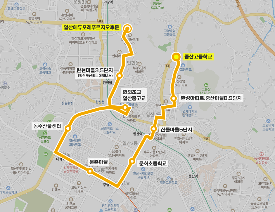 ◼ 막차 : 중산고등학교 - 23:00 | 일산에듀포레푸르지오후문 - 23:00