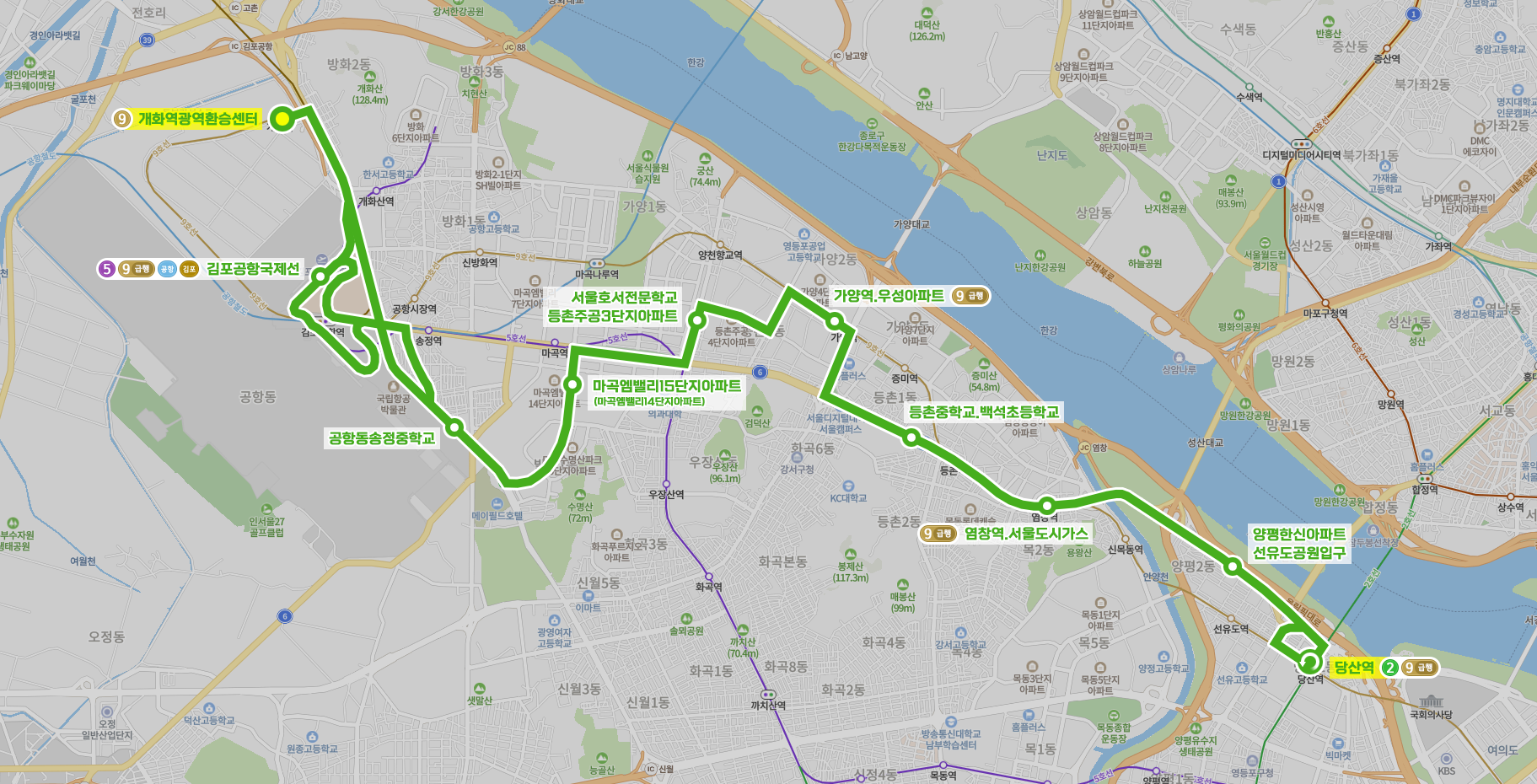 ◼ 상세 경유지 : 개화역광역환승센터 ↔ 개화역1번출구.개화검문소상 ↔ 개화2치안센터 ↔ 상김포공항국제선 → 한국공항공사 → 김포공항국내선 → 제과점앞 → 공항동주민센터 → 공항동천주교회 | 하국립항공박물관.공항동천주교회 → 공항동지하도입구 → 롯데몰.김포공항역 → 김포공항국제선 → 한국공항공사 → 김포공항국내선 → 방화동도시개발11단지 ↔ 공항동송정중학교 ↔ 강서면허시험장.메이필드호텔 ↔ 마곡수명산파크7단지 ↔ 마곡수명산파크5단지6단지상 | 마곡수명산파크3단지4단지하 ↔ 마곡수명산파크2단지 ↔ 마곡엠밸리15단지아파트상 | 마곡엠밸리14단지아파트하 ↔ 마곡역교차로상 ↔ 마곡동로사거리하 ↔ 발산역9번출구하 ↔ 발산역3번출구상 | 발산역2번출구하 ↔ 서울호서전문학교.등촌주공3단지아파트 ↔ 등촌3동주공4단지아파트상 | 등촌동부영아파트하 ↔ 등촌3동5단지아파트.등촌고등학교 ↔ 등촌3동주공10단지아파트상 | 등촌3동대림아파트하 ↔ SBS공개홀 ↔ 가양역.우성아파트 ↔ 가양역.마포중고등학교 ↔ 경복비즈니스고등학교하 ↔ 강서구청사거리.서울디지털대학교상 | KC대학교.강서LG베스트샵하 ↔ 등촌중학교 백석초등학교 ↔ 등촌역.강서보건소 ↔ 염창역.서울도시가스 ↔ 안양천입구상 | 영등포아리수정수센터하 ↔ 양평동한솔아파트상 ↔ 양평한신아파트.선유도공원입구 ↔ (당산역⟲ → 당산역) 이하 역순