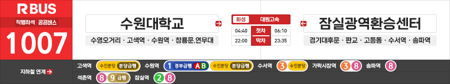 화성/수원/성남/서울시 직행좌석버스 대원고속 1007번 (수원대학교.수영오거리 ↔ 잠실광역환승센터)