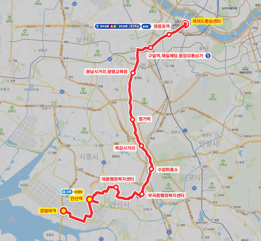 ◼ 상세 경유지 : 경원여객 ↔ 대화페인트앞상 | 위아주식회사하 ↔ 인텍전자상 ↔ 디에스테크상 | ㈜디아이씨하 ↔ 비츠로테크반대편상 | 신진전자하 ↔ 한국보훈복지공단앞상 | 초당약품하 ↔ 중소기업은행상 | 기업은행사거리하 ↔ 제일캐노피맞은편 ↔ 에이디켐테크상 | 이피엠테크하 ↔ 율촌화학앞 ↔ 유니엘플렉스 ↔ ZF상 | 대성산소사거리.터미널.영풍하 ↔ 삼일제약 ↔ 나염단지입구 ↔ 유통상가상 | 영림하 ↔ 안산역 ↔ 원곡동행정복지센터 ↔ 원곡고교 ↔ 관산중학교 ↔ 광신빌라상 | 대덕산업사택하 ↔ 성동연립상 | 선일중학교하 ↔ 차량등록사업소상 | 선부주공9단지하 ↔ 주공10단지건너편 ↔ 동명아파트앞 ↔ 선부초등학교 ↔ 수정한양상 | 공작한양하 ↔ 수정한양아파트상 | 온누리병원하 ↔ 와동체육공원 ↔ 롯데마트앞상 | 유명약국.고대정형외과하 ↔ 와동행정복지센터 ↔ 한국디지털미디어고등학교 ↔ 와동중학교 ↔ 열녀문사거리 ↔ 창동연립상 | 창동빌라건너편하 ↔ 삼성중앙빌라앞상 | 상우연립앞하 ↔ 21세기병원 ↔ 고잔주공7단지상 | 라성빌라하 ↔ 월피주공2단지앞하 ↔ 영현빌딩앞상 | 월피주공3단지하 ↔ 월피현대아파트상 | 월피한양아파트하 ↔ 성포중학교 ↔ 시랑운동장건너편 ↔ 부곡고등학교 ↔ 부곡동행정복지센터 ↔ 정재초등학교 ↔ 안산고등학교 ↔ 수암파출소 ↔ 목감동.목감마을 ↔ 목감사거리 ↔ 논곡동.산호아파트 ↔ 벌말 ↔ 원가학 ↔ 장절리 ↔ 광남사거리.광명교육청 ↔ 새마을시장 ↔ 광명사거리역.한진아파트 ↔ 광명사거리역 ↔ 현대아파트.개봉중앙시장 ↔ 개봉역.한마을아파트(중)상 | 개봉역.영화아파트(중)하 ↔ 동양미래대학.구로성심병원(중) ↔ 구일역.제일제당(중)상 | 구일역.중앙유통상가(중)하 ↔ 신도림동.구로역(중) ↔ 신도림역(중) ↔ 문래동남성아파트(중) ↔ 남부지방법원등기국.구로세무서(중) ↔ 영등포역(중) ↔ 전경련회관상 | 여의도공원하 ↔ (여의도환승센터⟲ → 유진투자증권 → 한국거래소 → 여의도지하차도입구) 이하 역순
