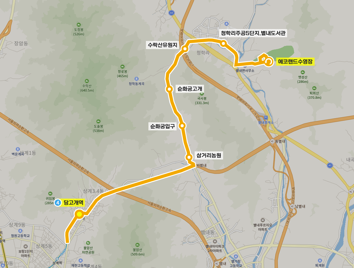 ◼ 상세 경유지 : 당고개역 ↔ 상계3.4동주민센터 ↔ 상계4동하 ↔ 삼거리농원 ↔ 불암산장 ↔ 능안마을 ↔ 순화궁입구 ↔ 순화궁고개 ↔ 수락산등산로입구 ↔ 수락산마당바위입구 ↔ 수락산유원지 ↔ 수락산입구 ↔ 수락산입구.동부거성아파트 ↔ 1단지.2단지.6단지.7단지 ↔ 청학리주공2.3단지.농협 ↔ 청학리주공5단지.별내도서관 ↔ 용암리입구.청학주공아파트 ↔ 별내면사무소 ↔ 에코랜드입구상 ↔ 에코랜드수영장 이하 역순