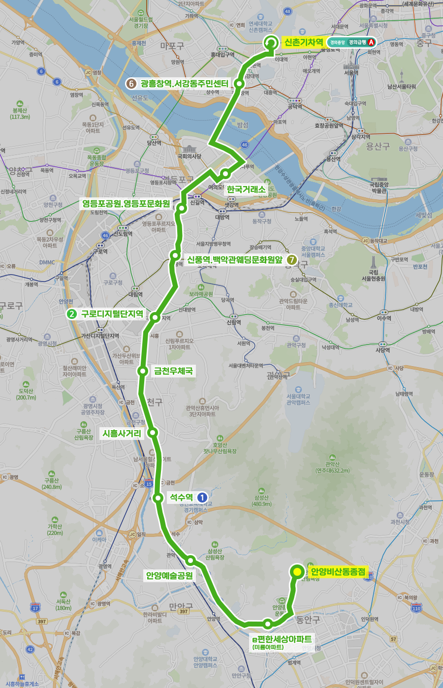 ◼ 상세 경유지 : 안양비산동종점 ↔ 안양인라인경기장 ↔ 종합운동장수영장.비산동교회상 | 행복마을아파트하 ↔ 종합운동장정문하 ↔ 종합운동장 ↔ 삼호아파트 ↔ 동양월드타워상 ↔ e편한세상아파트상 | 미륭아파트하 ↔ 삼성래미안아파트상 | 비산롯데캐슬.평촌래미안푸르지오하 ↔ 비산사거리.이마트 ↔ 안양예술공원 ↔ 관악역 ↔ 한마음선원.관악역이안아파트상 ↔ 대림.LG.힐스테이트아파트(중) ↔ 석수역 ↔ 시흥유통센터 ↔ 박미삼거리.국립전통예술중고 ↔ 시흥사거리 ↔ 금천구청.금천경찰서 ↔ 말미고개.금천소방서 ↔ 금천우체국 ↔ 문성초등학교 ↔ 구로디지털단지역 ↔ 동작상떼빌아파트상 | 서울영림초등학교하 ↔ 신대방경남아파트상 | 강남성심병원.대림성모병원하 ↔ 태양의집.KT대방지사 ↔ 신길주유소상 ↔ 신풍역.백악관웨딩문화원앞 ↔ 신길한화꿈에그린아파트하 ↔ 신길힐스테이트클래시안아파트상 | 신길가마산로교차로하 ↔ 우신초등학교 ↔ 대성병원하 ↔ 영등포공원.영등포문화원 ↔ 전경련회관상 | 여의도공원하 ↔ 여의도지하차도입구하 ↔ 한국거래소 ↔ 삼부아파트상 | 여의도공작아파트하 ↔ 여의나루역 ↔ 여의도공원하 ↔ 여의도순복음교회 ↔ 광흥창역.서강동주민센터 ↔ 창전현대홈타운 ↔ 신촌로터리 ↔ 신촌오거리.2호선신촌역 ↔ 신촌기차역⟲ 이하 역순