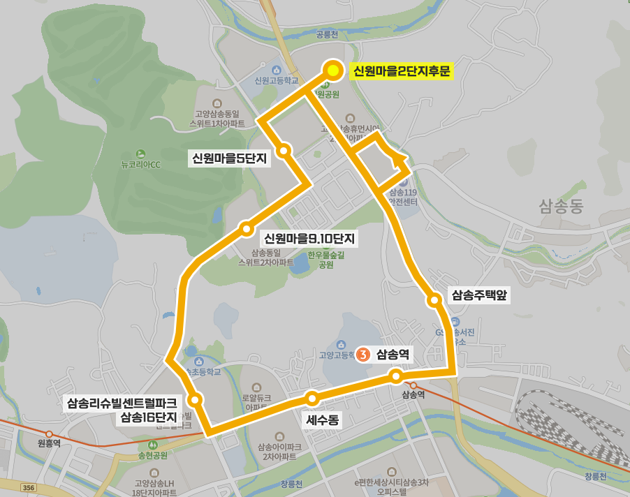 → 삼송역 ▷ 신원마을2단지후문 방면만 신원마을3단지후문 정류장을 경유하오니, 이 점 참고하시기 바랍니다.